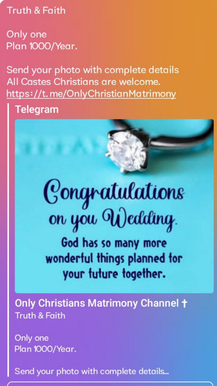 Truth & Faith Only one Plan 1000/Year. Send your photo with complete details All Castes Christians are welcome. https://t.me/OnlyChristianMatrimony